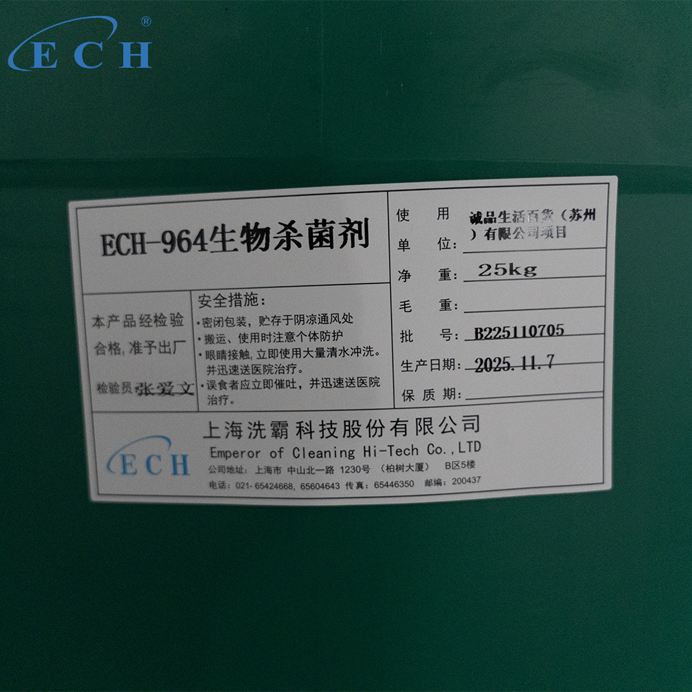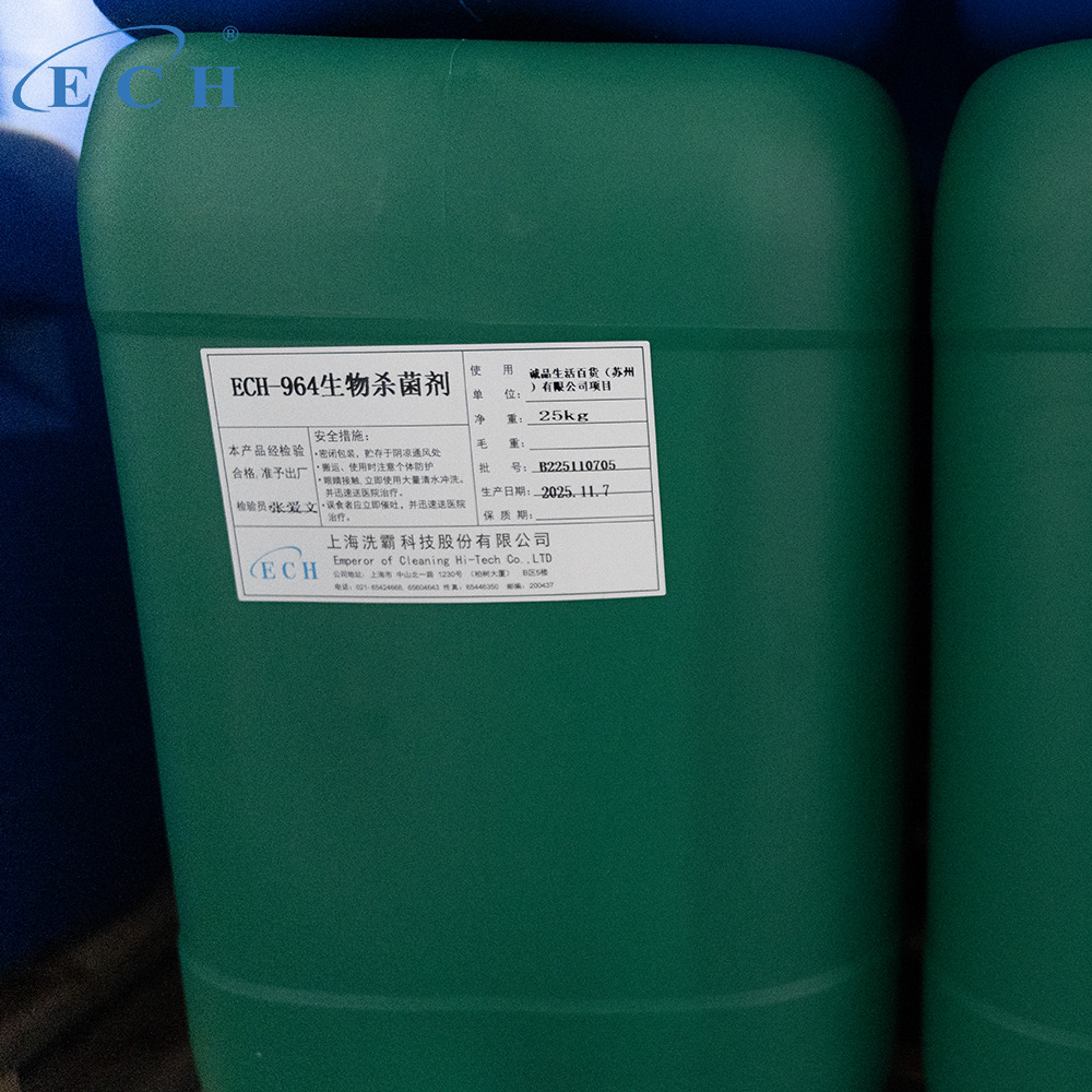 ECH-964 Biological Fungicide is anew-type broad-spectrum water treatment biocide and algaecide independently developed for the problem of microbial contamination in circulating water systems. It integrates high-efficiency bactericidal, algaecidal, and metal corrosion functions, and has excellent compatibility with water treatment auxiliaries such as scale and corrosion inhibitors. It is widely used in industrial circulating water, central air conditioning circulating water, cooling water towers and other systems to effectively solve the problems of equipment corrosion, pipeline blockage and heat exchange efficiency reduction caused by microbial reproduction, and extend the service life of water treatment equipment.
